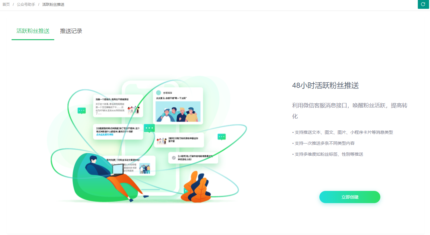 授权成功后进入管理平台,进入「活跃粉丝推送」,点击创建