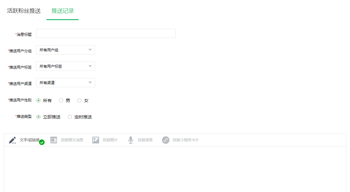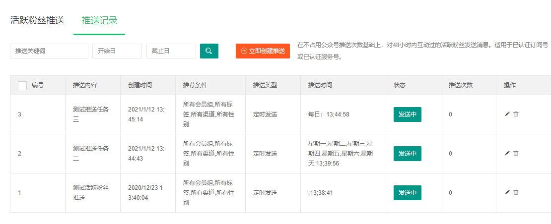 发送成功后,重新进入「活跃粉丝推送」即可查看刚才下发任务的发送情况。