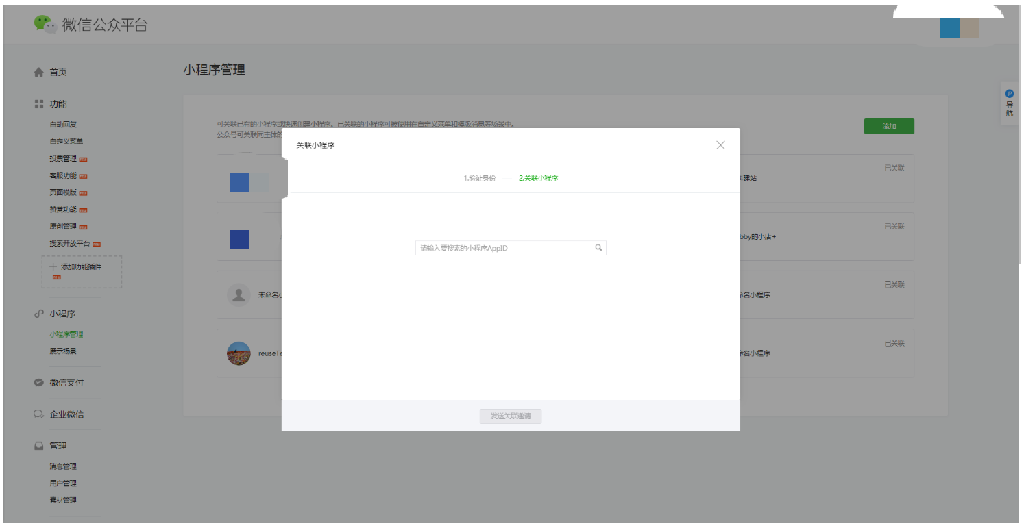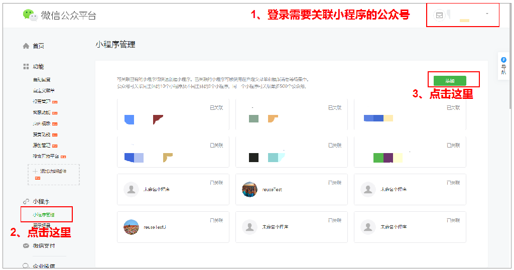 一、登录需要关联小程序的微信公众号后台,在左侧找到“小程序”-“小程序管理”,然后点击“添加”按钮。