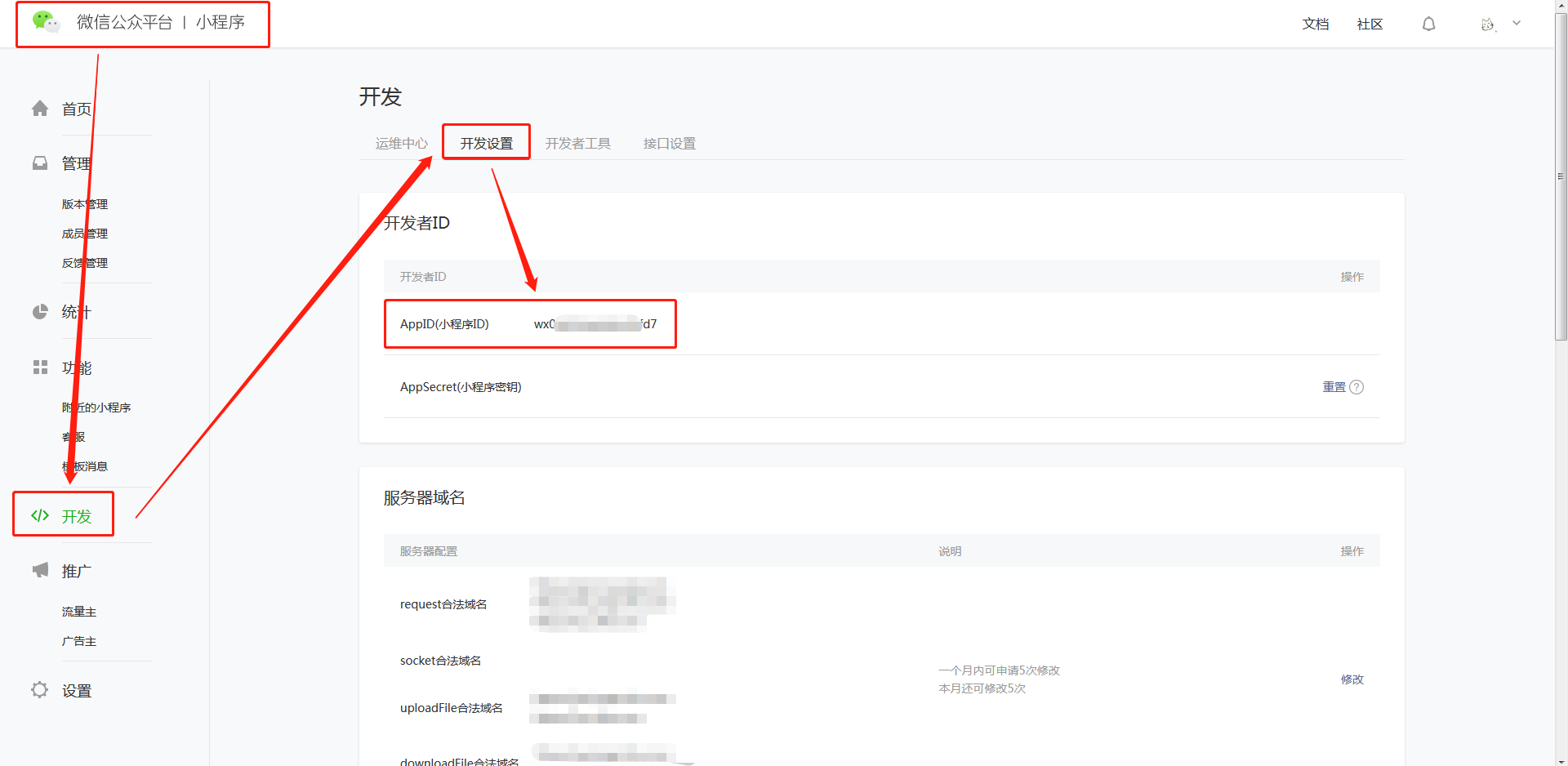 首先我们登录微信小程序管理后台,点击“开发”-“开发设置”,在“开发者ID”下找到AppID,也就是小程序ID。