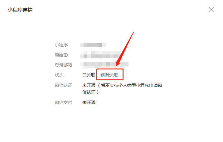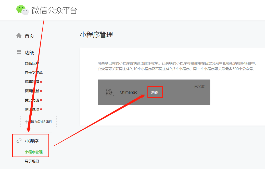 1、我们先登录要解除关联的微信公众号后台,进入“小程序”-“小程序管理”,选择要解除关联的小程序,点击“详情”。(注意:这里登录的是微信公众号的后台,不是登录微信小程序的后台!)