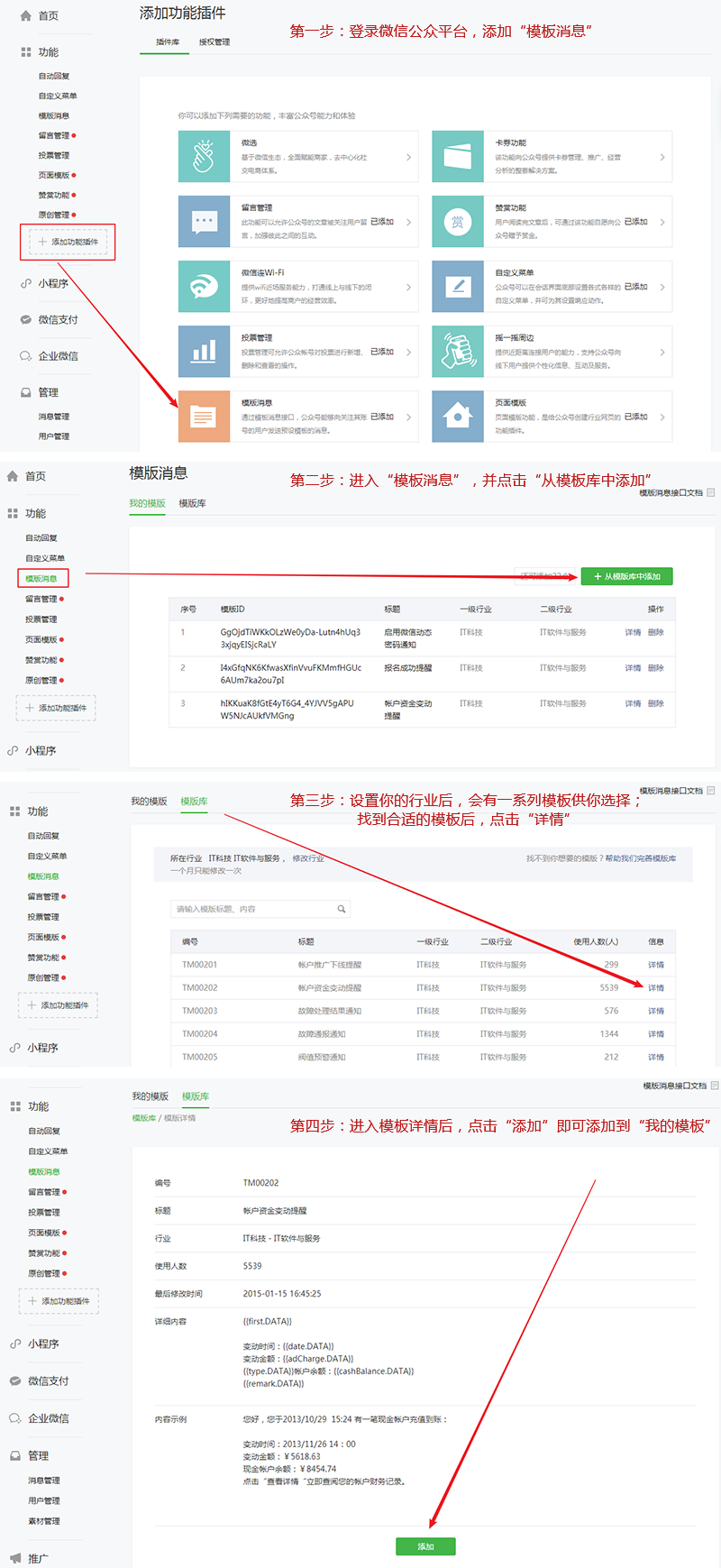2.可以自行在微信公众平台申请增加模板,微信审核通过后即可使用;