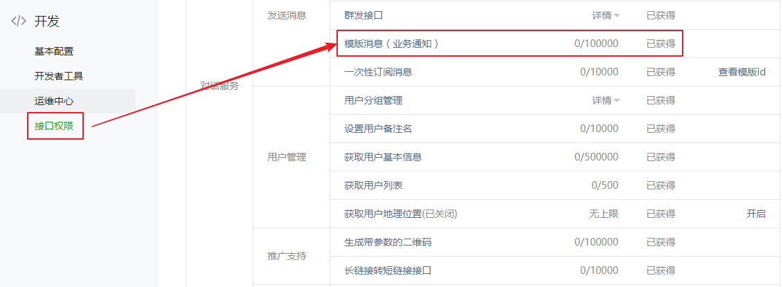 A:智慧公众号助手中无任务限制,但会受公众号后台“模板消息”接口调用上限的限制(发送给一个粉丝算1次),调用上限次数可在微信公众平台“接口权限”中查看,调用上限不是固定的,会随着粉丝量的上涨而上涨,如下: