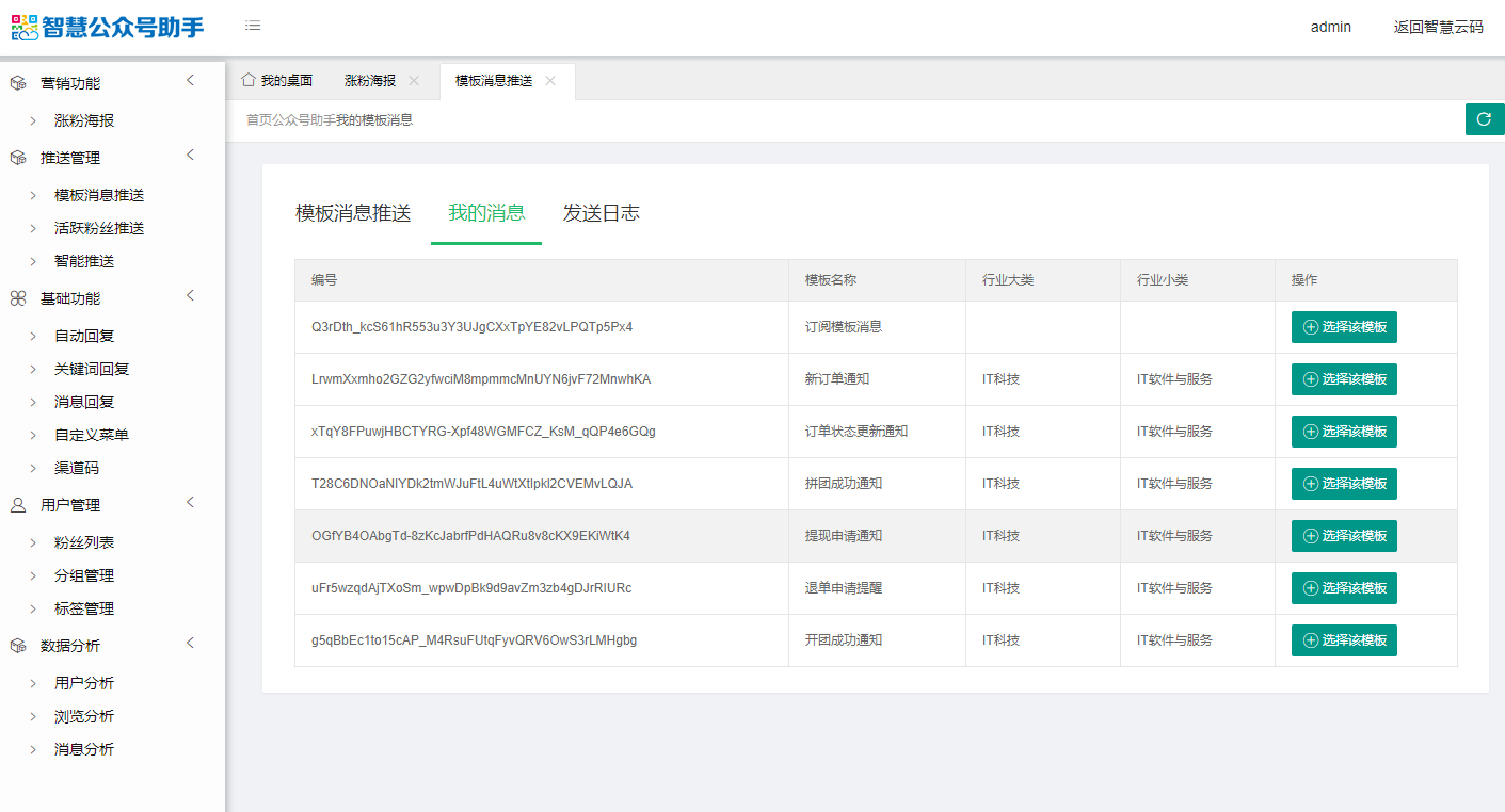以上两步都完成后,即可在智慧公众号助手中推送模板消息了。