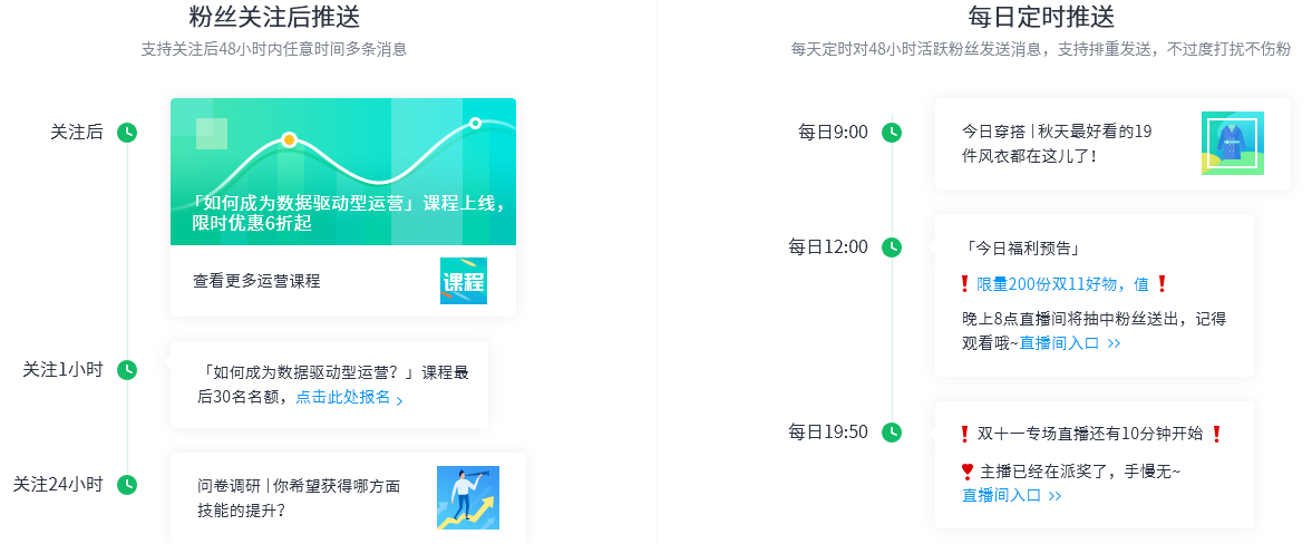 针对48小时活跃粉丝提前设置好内容,当粉丝触发发送规则后,立即推送,及时转化粉丝,实现精细化运营。