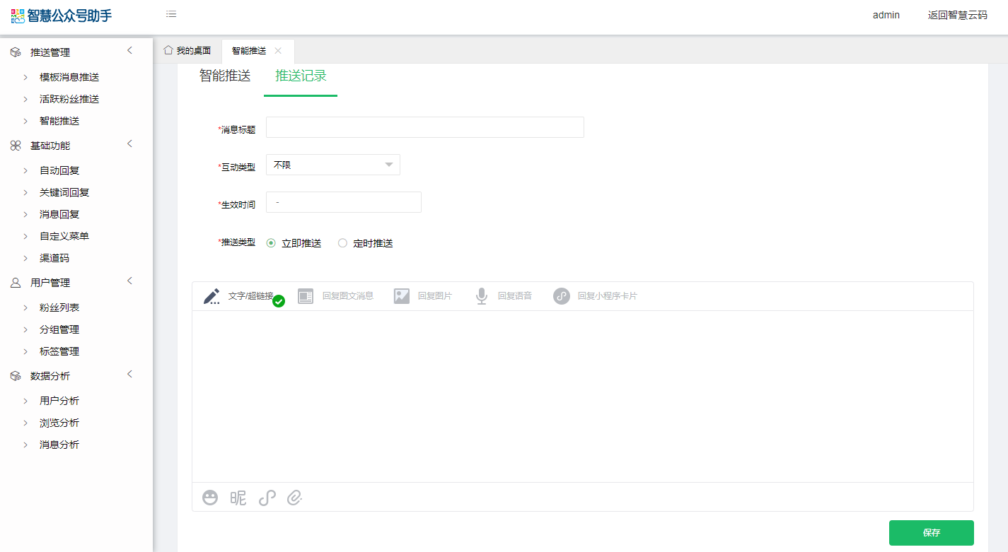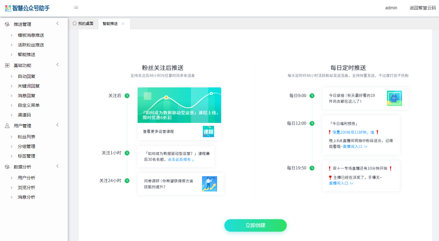 授权成功后进入管理平台,进入【智能推送】,点击创建