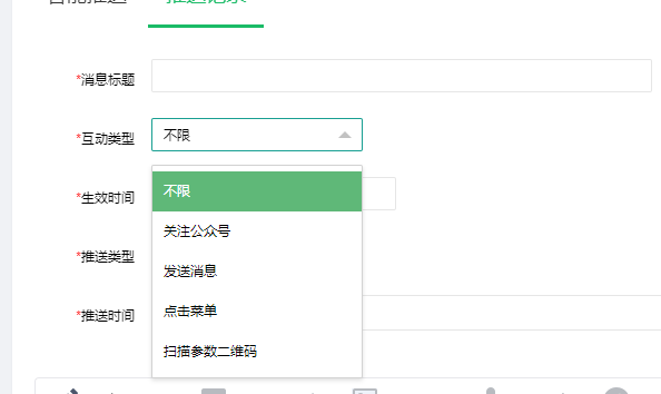 互动类型包括【关注公众号】【点击菜单】【发消息给公众号】【扫描二维码】。如果粉丝符合所选类型则给其下发消息。但所有互动行为都仅48小时内有效。
