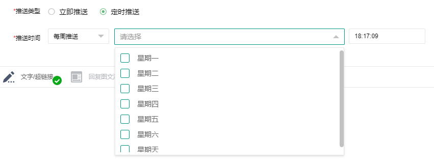 定期发送:设置一定的时间,在该时间给所有符合下发规则的粉丝发消息。支持每日或每周定时发送。