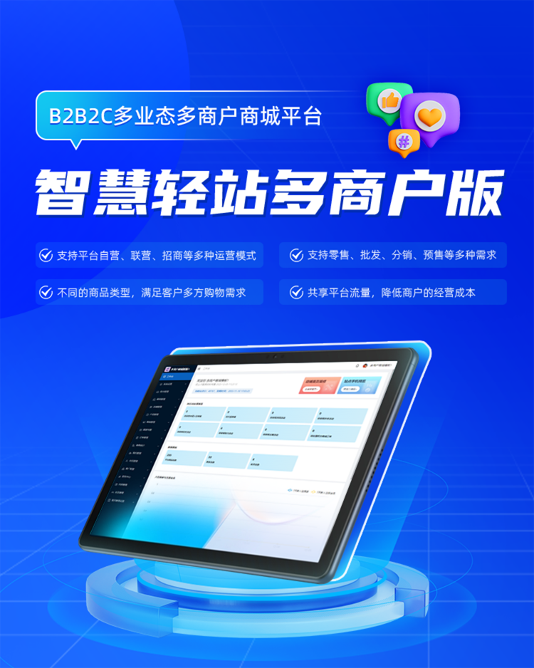 智慧轻站多商户平台是B2B2C多业态商家入驻模式的多商户商城系统,系统支持平台自营、联营、招商等多种运营模式,可满足企业新零售、批发、分销、预售、O2O、商铺入驻等各种业务需求。满足客户多方购物需求,共享平台流量,打造购物商圈,降低商户的经营成本,使平台经营者获得更多收益。