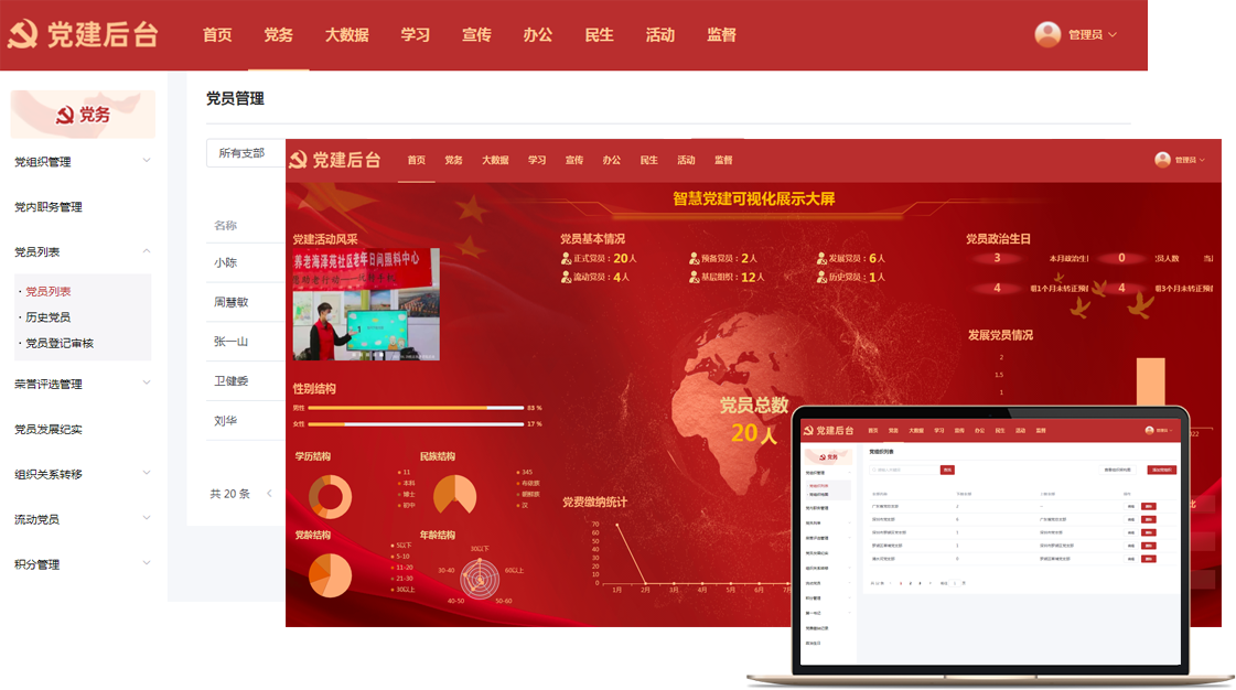 基层党建,最直接面对群众的干部群体。他们需要特色展示,将向上级报送的一些资料存入系统中,三会一课的开展,党员管理,党员教育,及党中央对党员的号召融入到党建软件中。