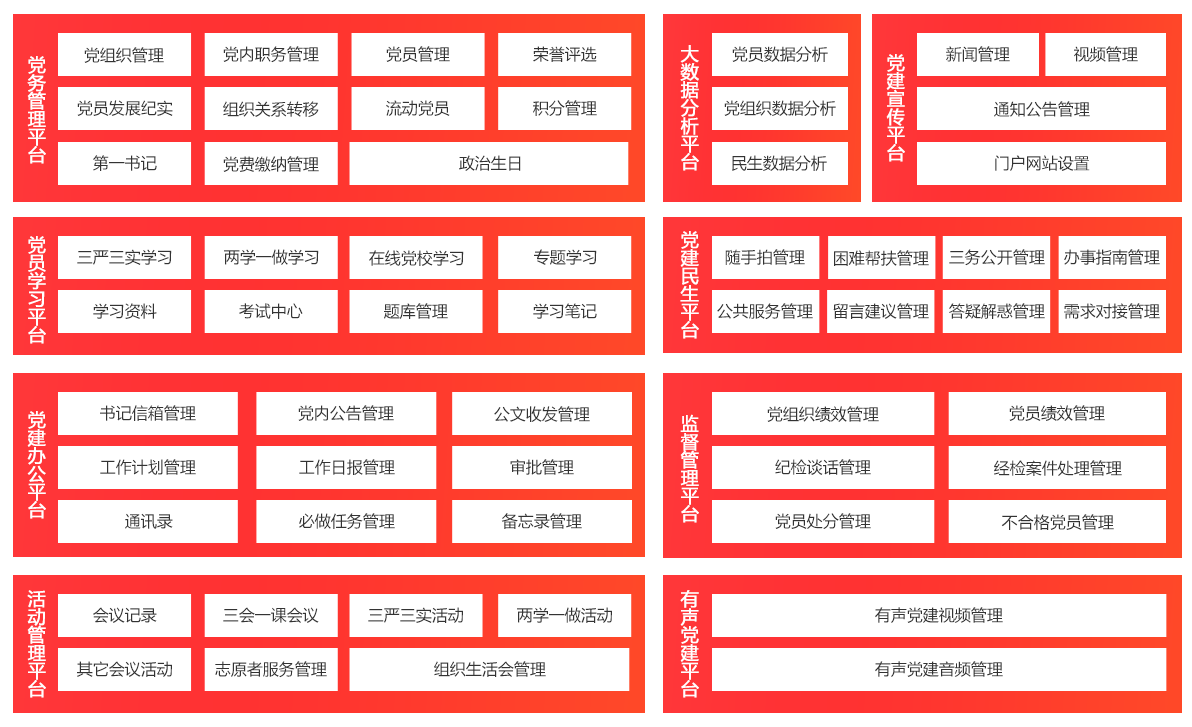 包含三会一课、党建考核、网络课程、党费缴纳等多项功能,解决党建工作数据庞杂、党员数量多且分散,管理成本高等痛点。