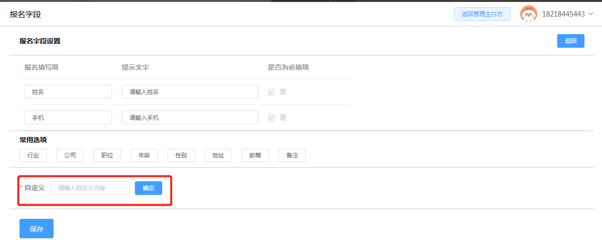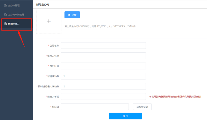 新增主办方模块填写主办方的资料并提交,可以新建一个主办方。