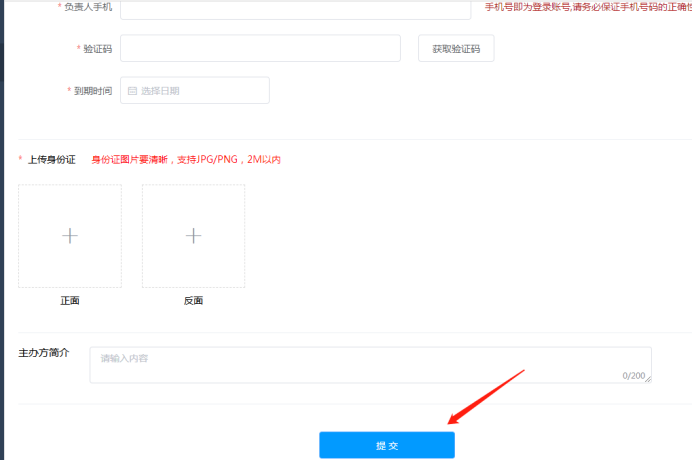 必填信息填写和确认好后,点击提交开通主办方账户。如下图所示: