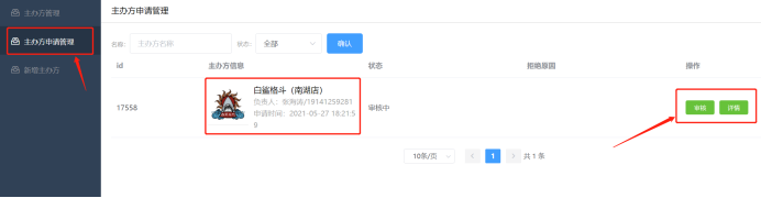 主办方申请管理,可查看参与者申请成为主办方的列表,进行审核和查看详情等。如下图所示: