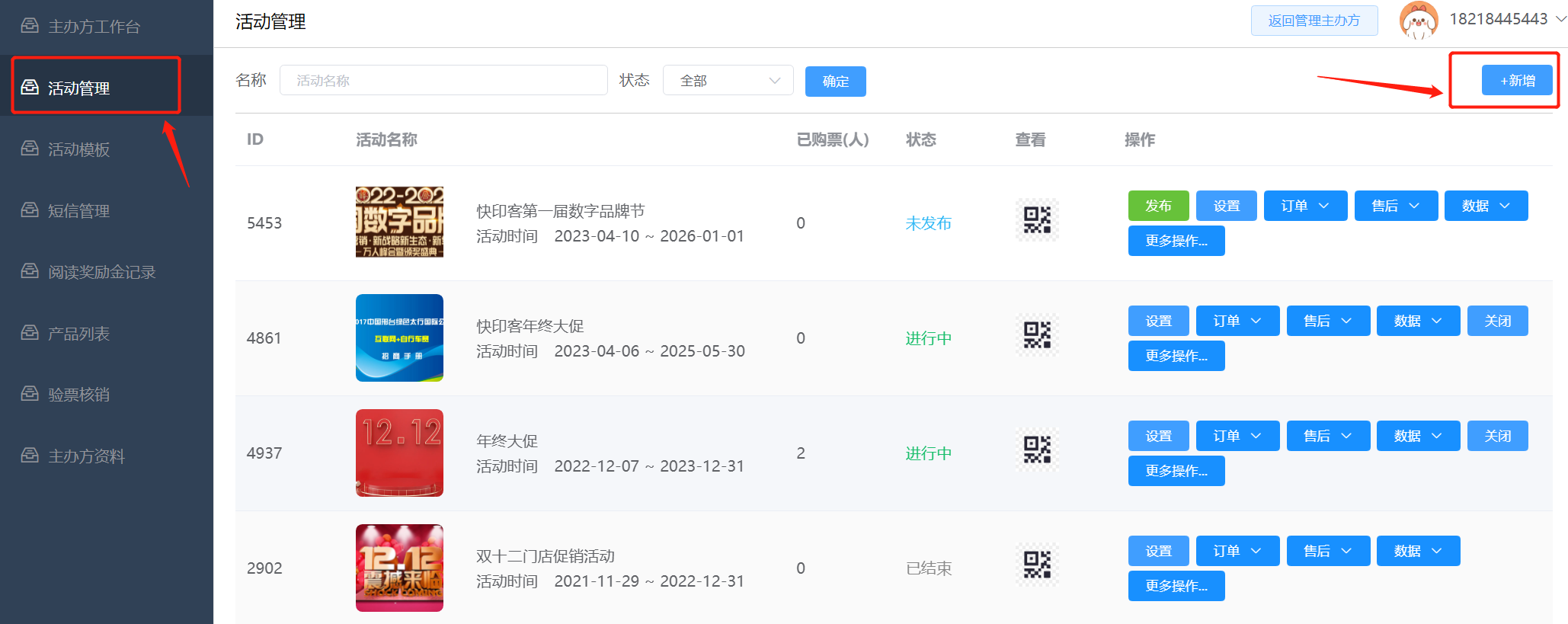 2.4管理:点击管理进入主办方工作台,查看主办方下创建的活动数,浏览数据,以及可以快速充值阅读营销奖励金,短信数量等。如下所示: