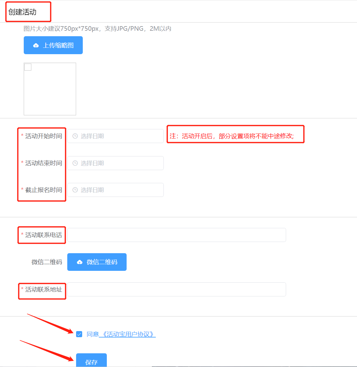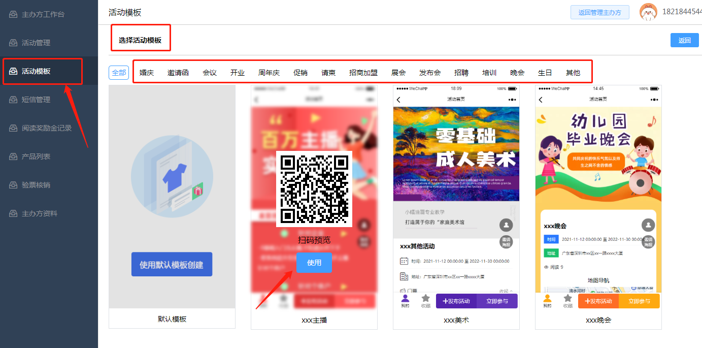 2.5 活动模板/活动管理:均可以在该主办方下面新增活动。根据当下活动实际情况选择现有模板或者创建空白模板,活动主题、活动时间、活动地址等如实填写,必填项必须完善(活动时间请确认好,一旦提交和发布该活动,时间不可修改)。如下所示: