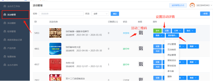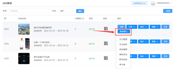 更多操作:可查看评论管理,互动抽奖数据,佣金管理,复制活动,群发短信,以及查看参与者信息。如下所示: