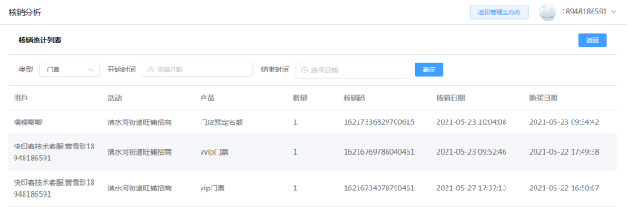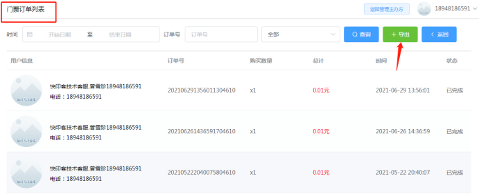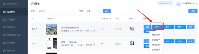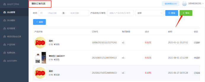 关于订单:点击后即可看到该活动下产生的爆款,拼团,门票,助力订单信息。可以查看订单客户付款时间、客户详情、订单状态。按时间段筛选订单,同时也可以表格形式导出订单。如下图所示: