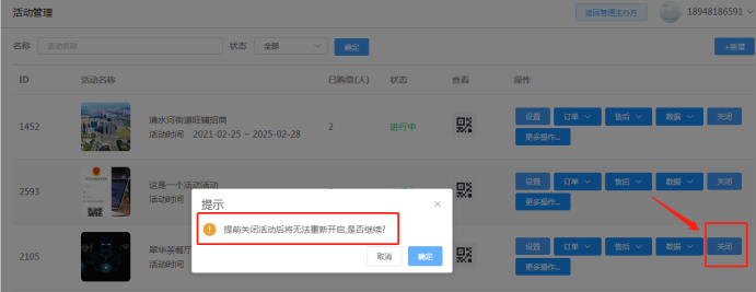 关闭:点击关闭就是结束该活动。一旦关闭不可再次开启,请谨慎操作。如下提示所示: