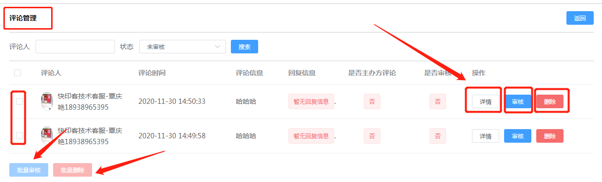 评论管理:可以查看该活动下用户的评论,主办方可决定是否通过审核显示,或者针对不好的言论直接删除。如下所示: