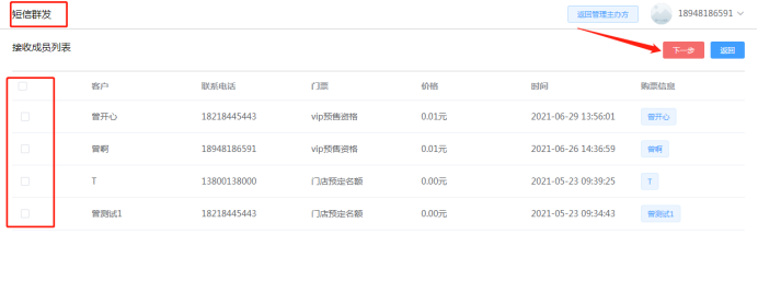 群发短信:即通过报名购买门票的客户,自行选择给哪些客户发送短信群发通知活动。如下所示:
