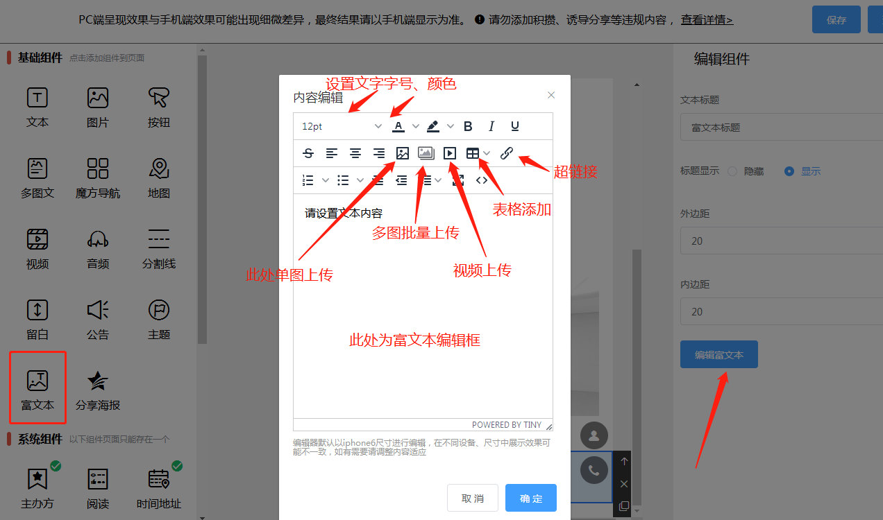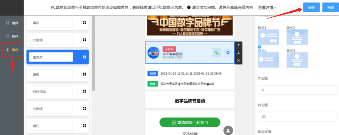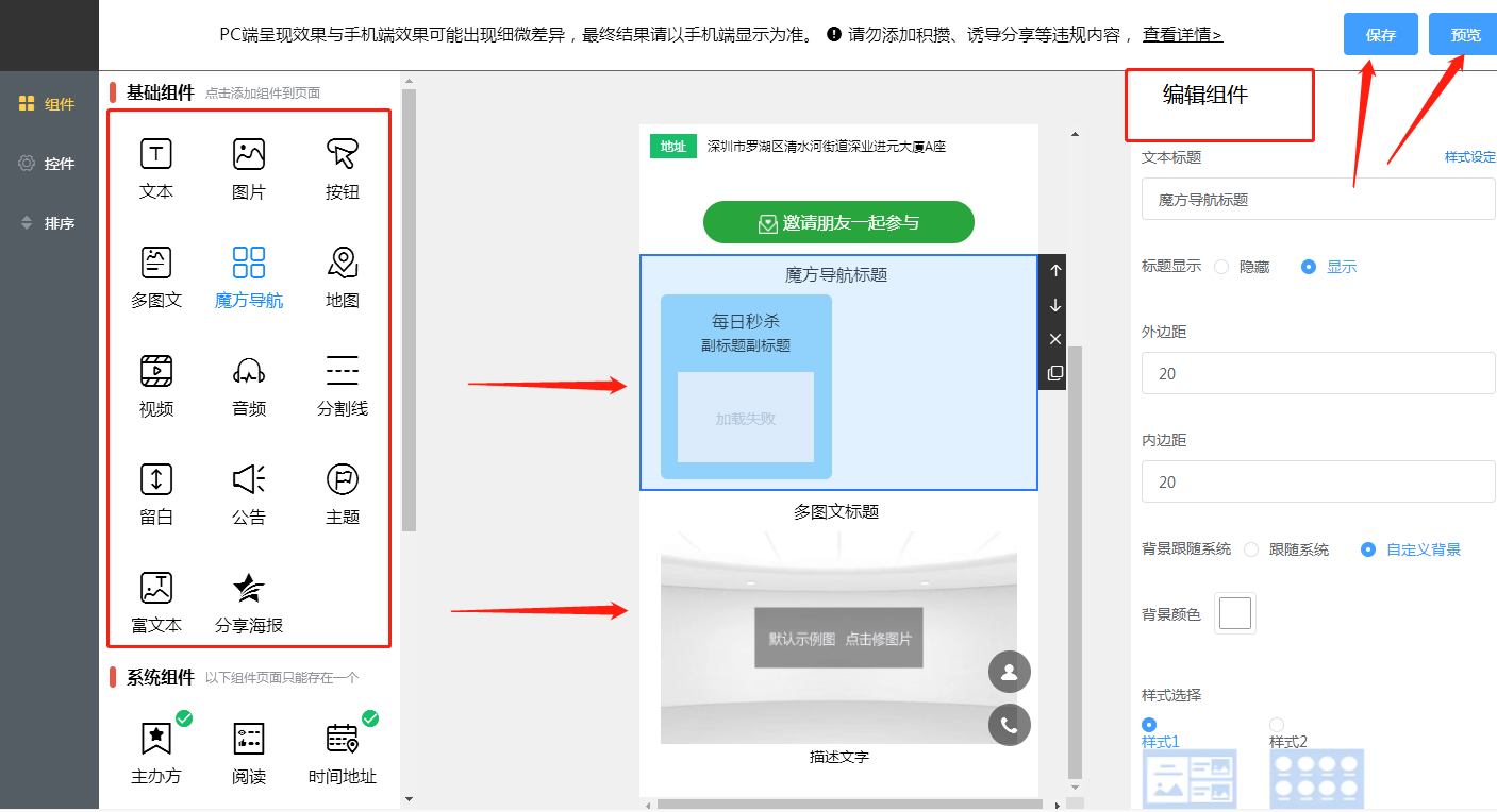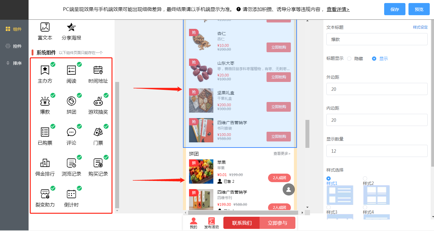 2.62 装修:进入设计活动首页,根据活动情况添加组件。分为基础组件和系统组件,基础组件可以重复添加和删除。每个组件可以进行相关样式和顺序调整。以及结合活动具体需求,增加各类组件完善,如下所示: