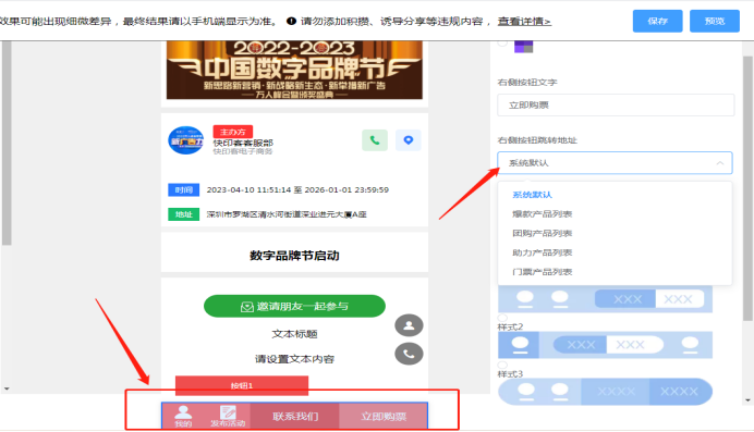 底部菜单:可以更改底部菜单显示样式,并设置立即参与指向的链接内容,可以选择默认,也可以自行根据需要调整。如下所示: