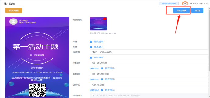 2.65推广海报:默认分享海报图,可自定义上传,按照要求上传分享海报(尺寸750x1334p支持jpg png格式、大小2M以内)以及设置海报上所展示信息。如是否显示昵称,头像。主标题,副标题自行设置,活动时间根据该活动实际的启动时间显示。设置后右上角记得保存当前数据,手机端浏览可生成海报进行分享。如下所示: