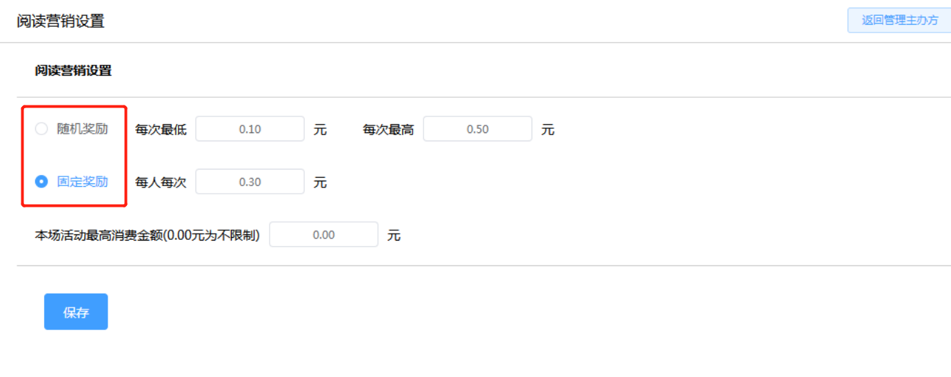 奖励金设置有随机奖励和固定奖励,随机奖励即在最低和最高金额区间中随机产生;固定奖励即每人每次都是固定的奖励金。如下所示: