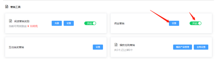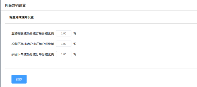 2.67 佣金营销:开启后根据活动实际情况,设置佣金分成规则,此为佣金比例,只有以下3种方式可以获得:邀请报名成功即是分享购买门票;抢购下单即是爆款抢购营销产品;拼团下单即是团购营销产品分佣。如下所示: