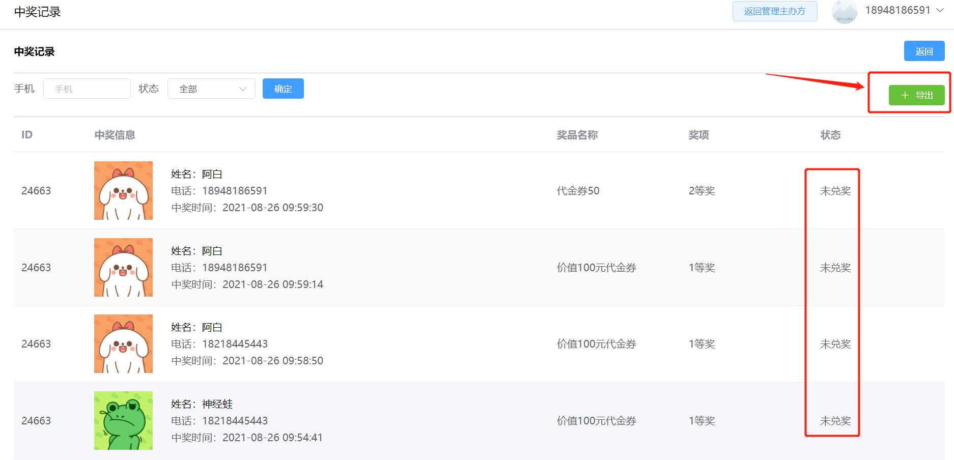 中奖记录:即该抽奖游戏中中奖人员信息,可查看是否兑奖状态,并导出表格数据。如下所示: