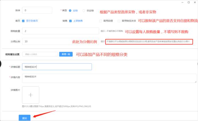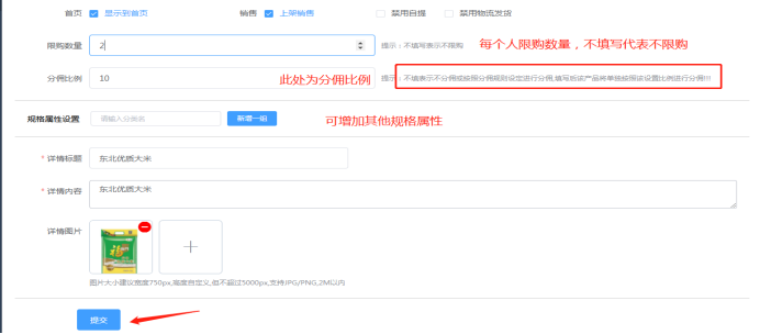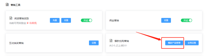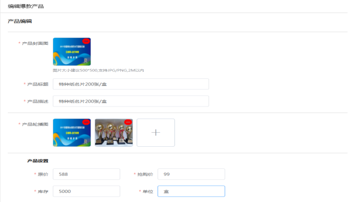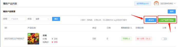 2.69 爆款抢购营销:根据活动需要发布爆款抢购产品,即秒杀产品。可以新发布,或者原先有产品库上传过直接选择产品库的产品上架。带*号为必填。可设置产品介绍、原价、抢购价、产品分佣比例。直接单个发布新爆款产品,也可点击产品库先在产品库新增产品,再选择使用。如下所示: