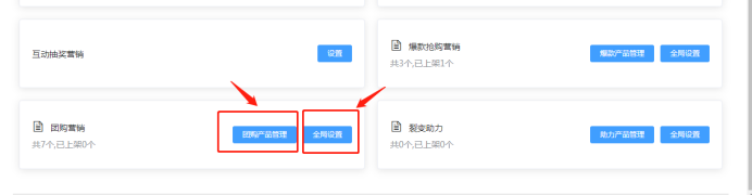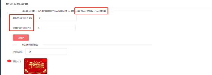 2.691 团购营销:全局设置:根据活动需要上线团购产品,及设置最低成团人数和组团时间(活动发布后不可变更)。如下所示: