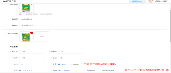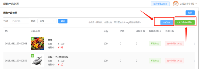 团购产品管理:可新发布拼团产品,设置产品介绍、原价、拼团价、产品分佣比例。直接单个发布团购产品,也可点击产品库先在产品库新增产品,再选择使用。如下所示: