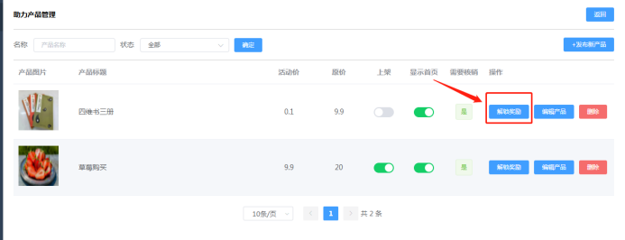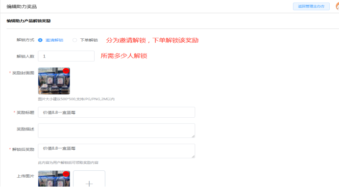 2.692裂变助力:通过设置助力产品,引导用户购买后做分享裂变,同时根据设置的活动要求,分享解锁,通过邀请解锁或者下单解锁,对应可以获得奖励。如下所示: