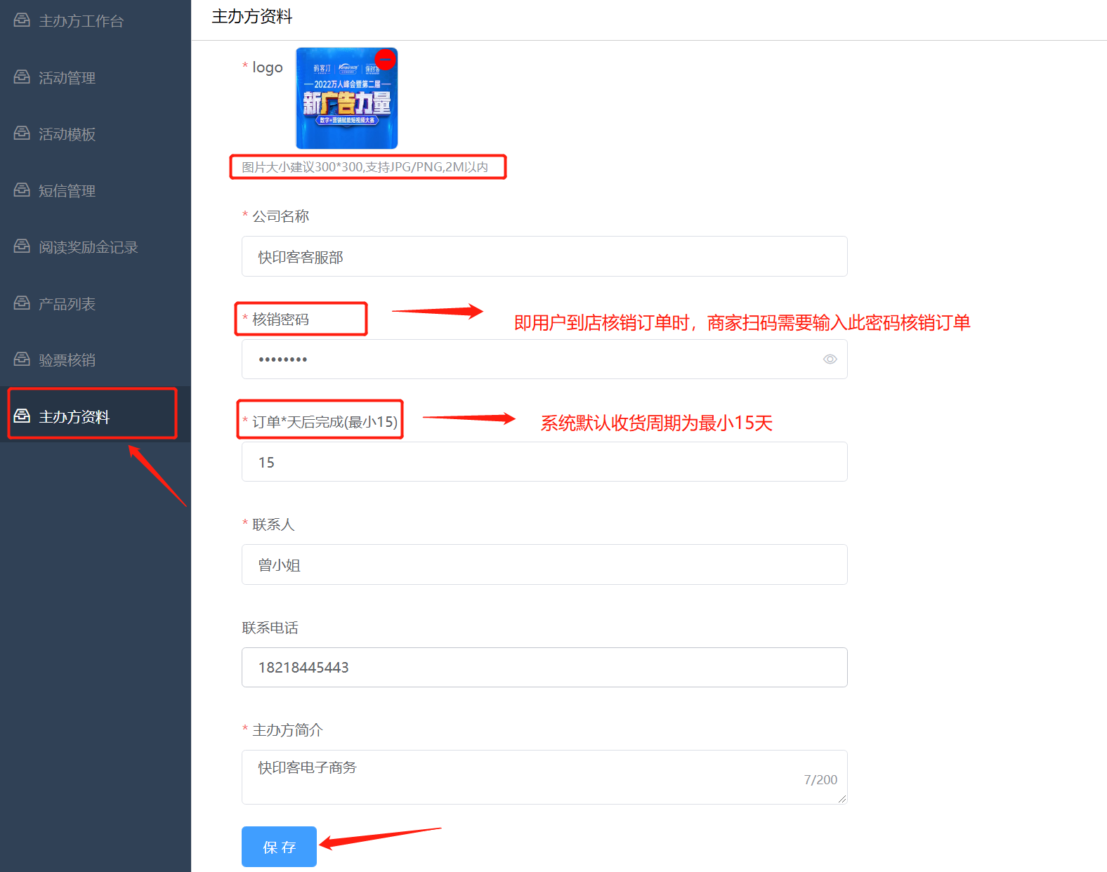 2.11: 主办方资料:可以修改更新主办方头像,名称,电话等,另设置核销密码,即用户自提订单到店核销商家输入的密码;订单完成天数最小15天,也就是默认自动确认收货周期。如下所示: