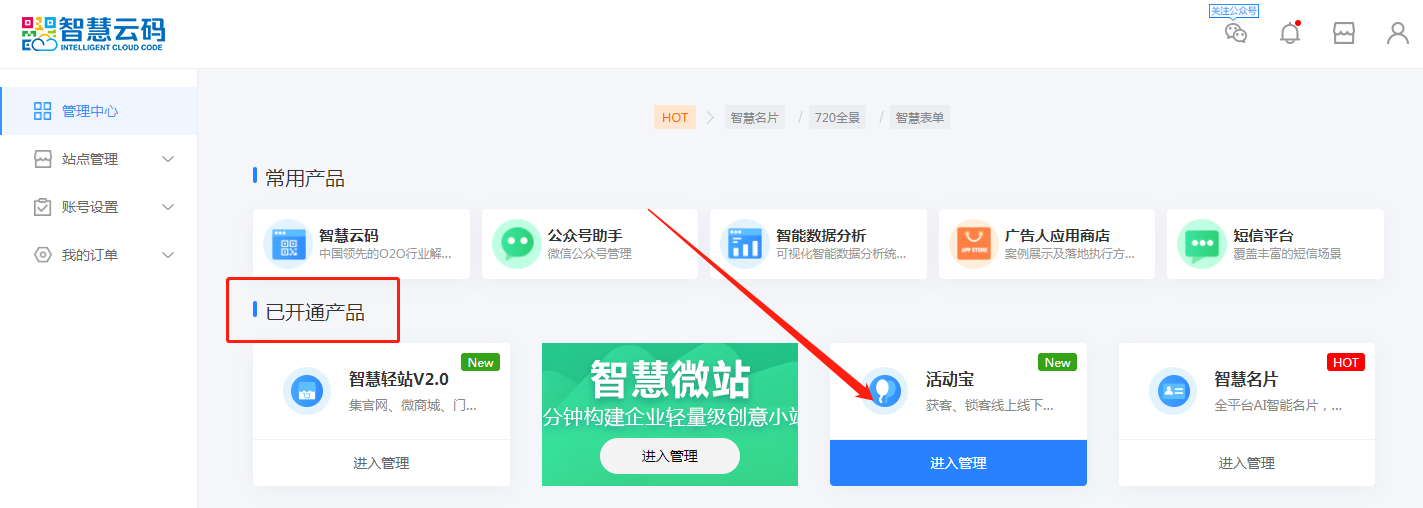 第一步:登录智慧云码后台,找到已开通产品-活动宝,点击进入,如下图所示: