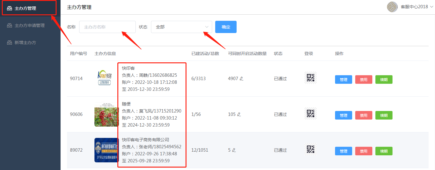 2.1这里就是后台已经创建的所有主办方账户。可以通过主办方名称,状态进行搜索。