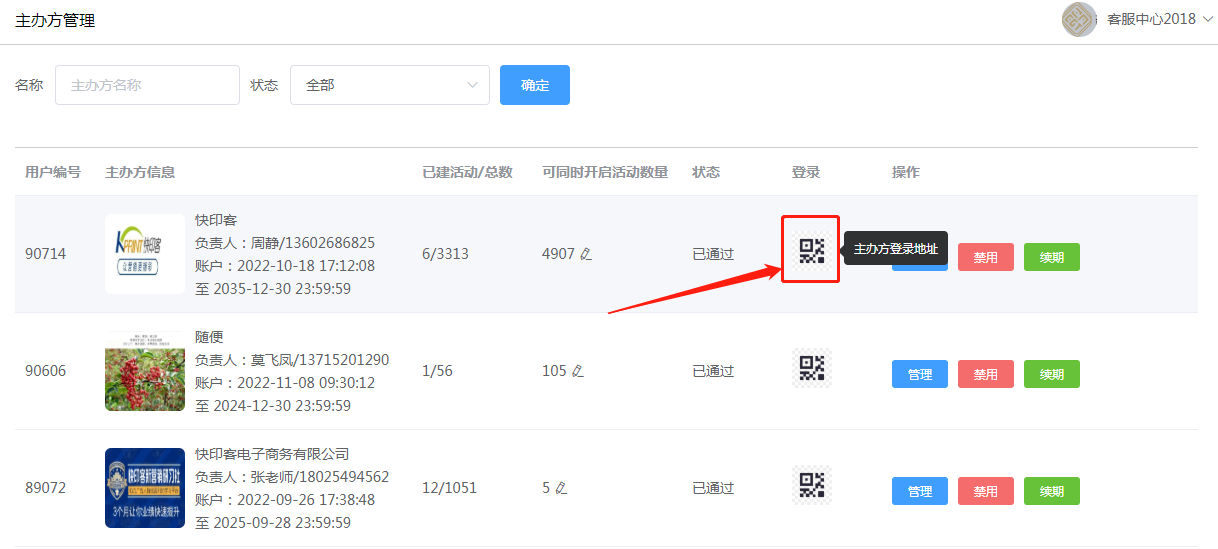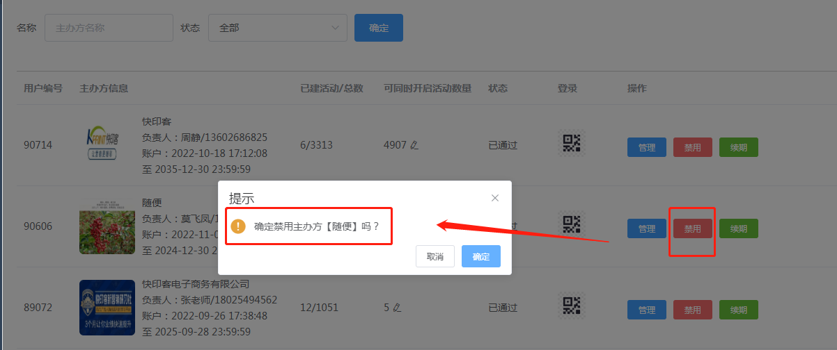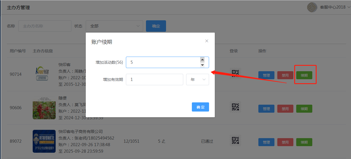 2.3禁用和续期:续期可增加主办方的创建活动数和增加账户有效期;禁用即是停止该主办方的所有功能(谨慎操作) 。如下所示: