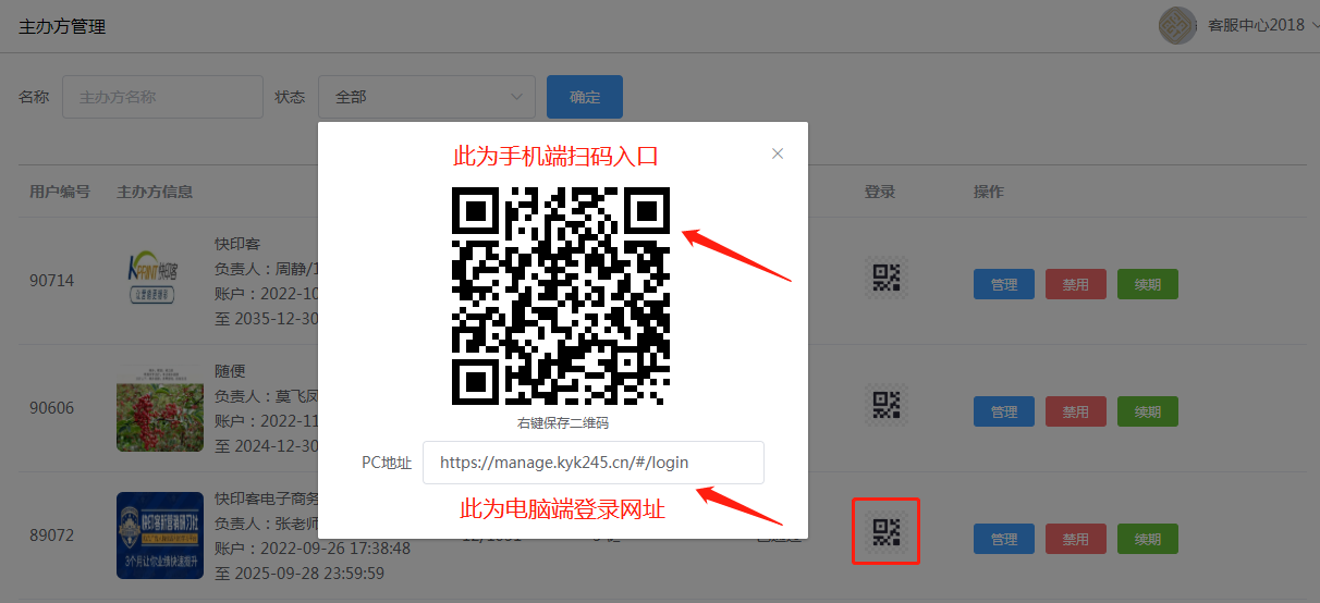 2.2主办方登录地址:点击打开主办方资料位置,“登录”二维码,即可扫码凭主办方手机号和验证码登录,以及可以pc电脑端登录网址发送给商家,单独登录进行管理。如下所示: