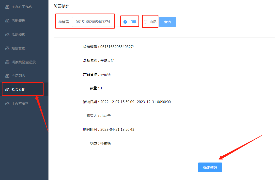 2.10 验票核销:当用户下单后,到店可通过用户下单后手机上的核销串码输入进行核销(根据购买产品类型,如爆款/拼团/门票,在手机端对应订单位置找到)商家在电脑端该位置可以选择商品,或者门票,输入核销串码点击进行核销。如下所示: