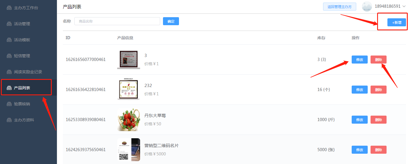 2.9产品列表:可在此处自行新增产品,此处为产品库。可自行设置修改产品信息,库存、价格、规格属性等。或者删除操作。另在添加爆款/团购产品时,也可以直接选择产品库里的商品使用。如下所示: