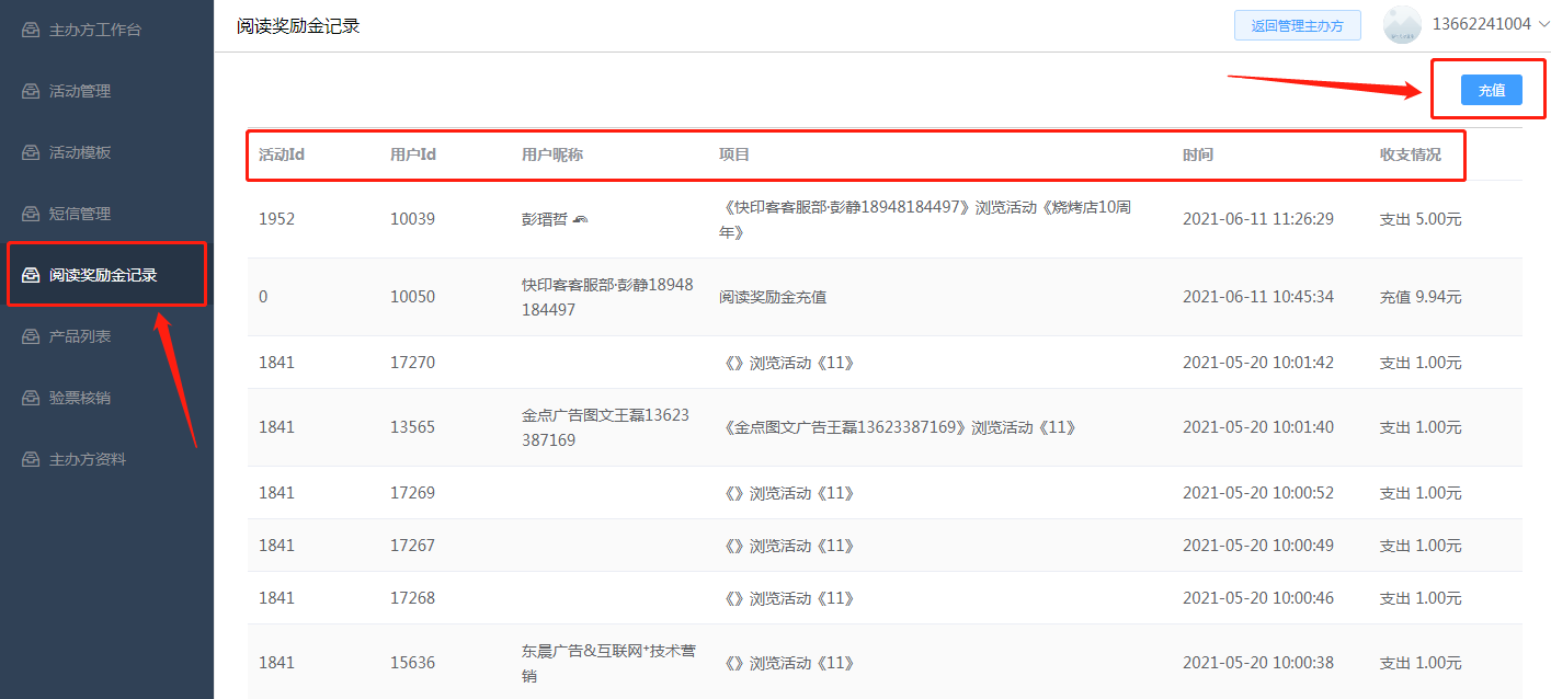 2.8阅读营销奖励金:此处为该活动下,阅读营销奖励金收入和支出领取的记录。同时可以在此处进行充值。如下所示: