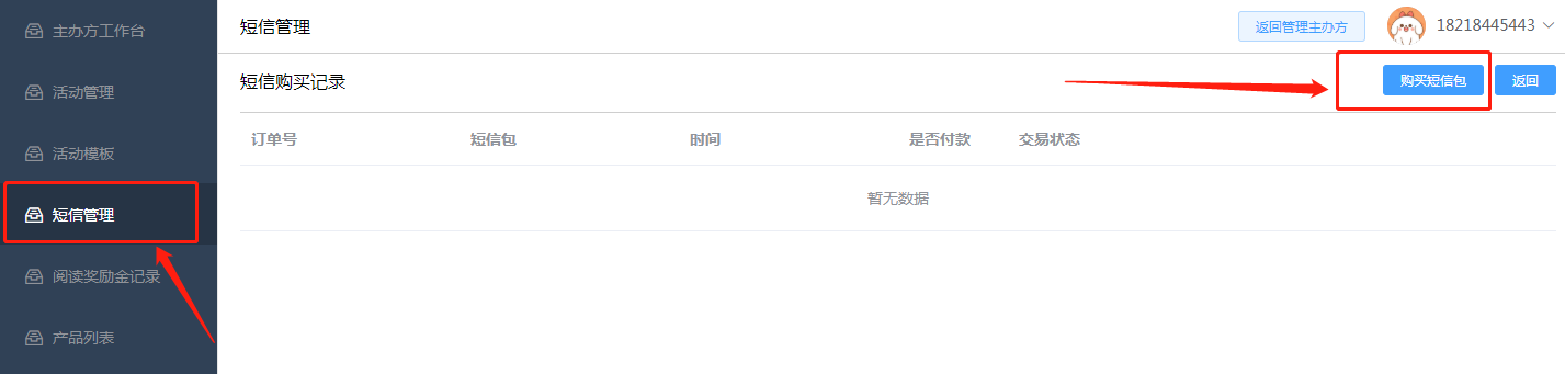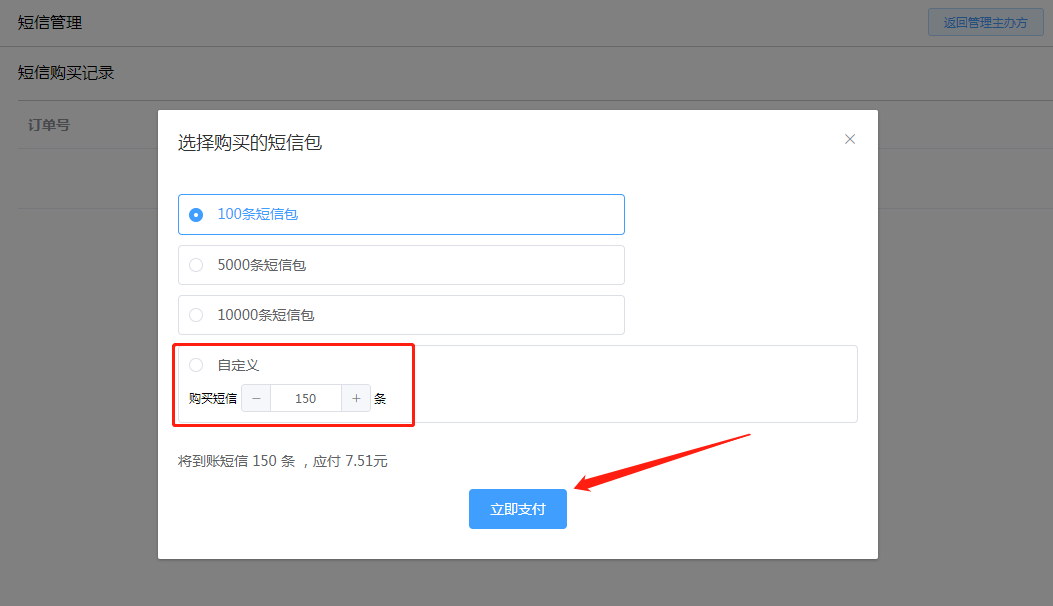 此处短信管理是主办方可以购买短信条数,用于短信群发通知参加活动的用户(即购买门票用户),购买短信条数可以根据需要自定义数量,如下图所示: