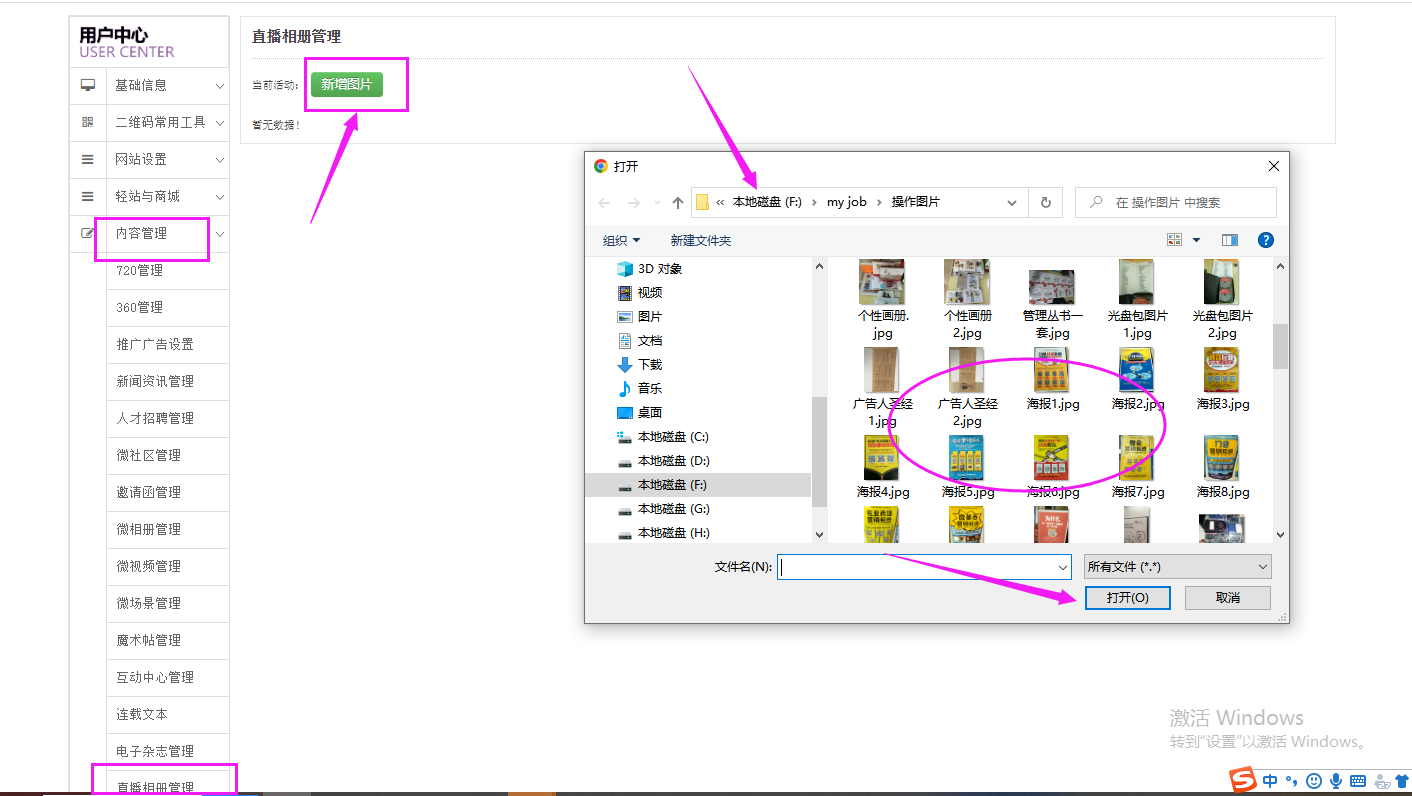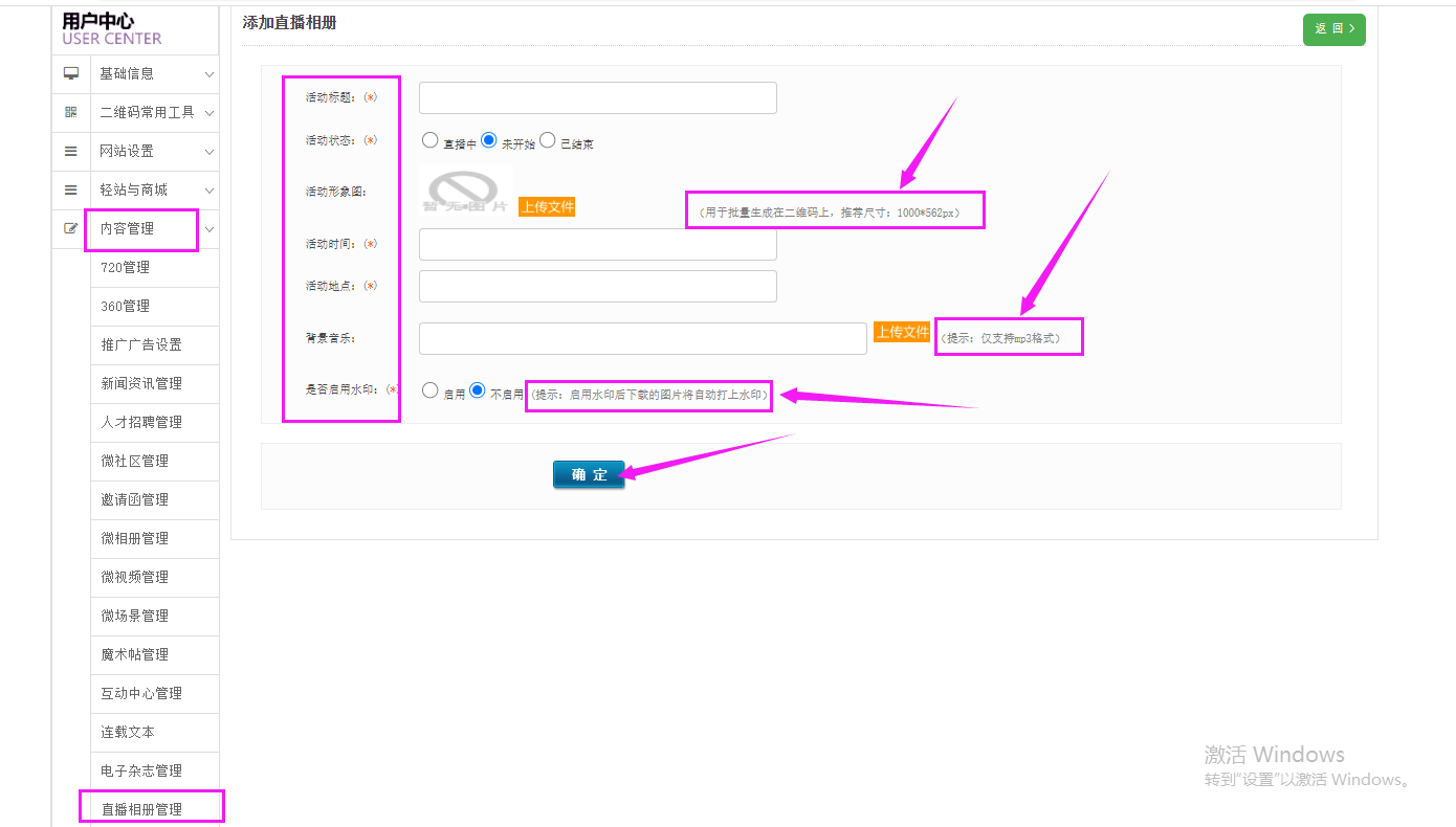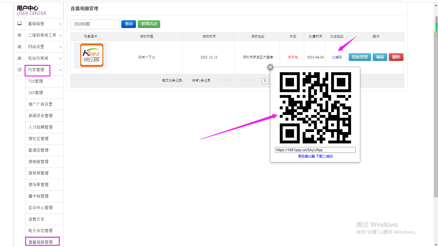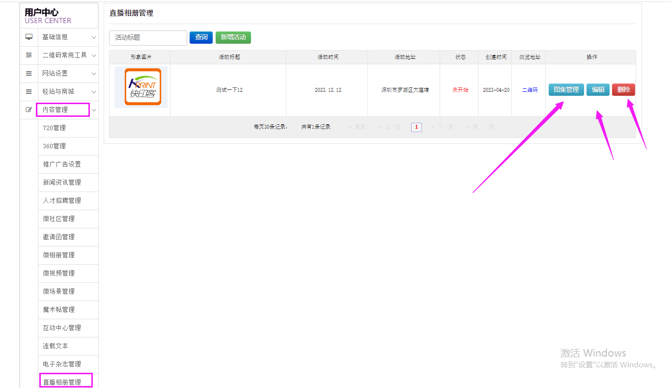 1、首先登陆智慧云码系统,找到左边内容管理处,找到直播相册管理,点击新增活动,如下图所示: