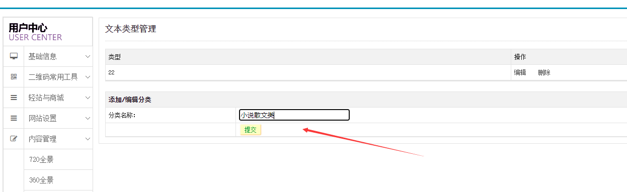 1.1登录智慧云码系统,点击智慧云码,找到内容管理,点击连载文本,点击管理类型栏目,先给连载文本设置分类,如下图所示