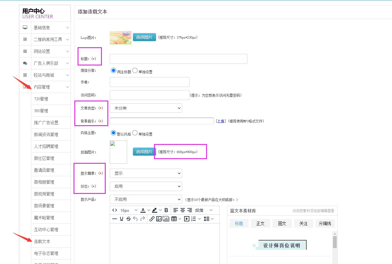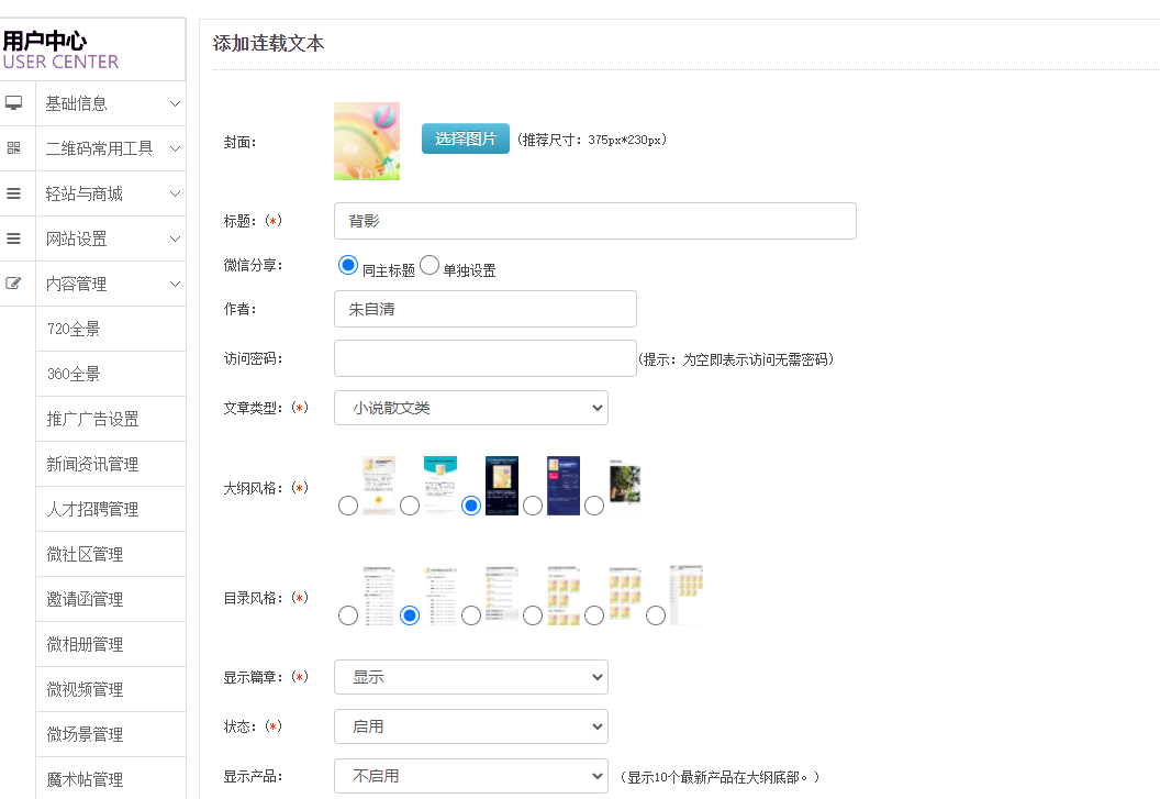 文章类型选择其对应的所属分类;大纲风格和目录风格按自身需求选择相应的风格;显示篇章选择显示;