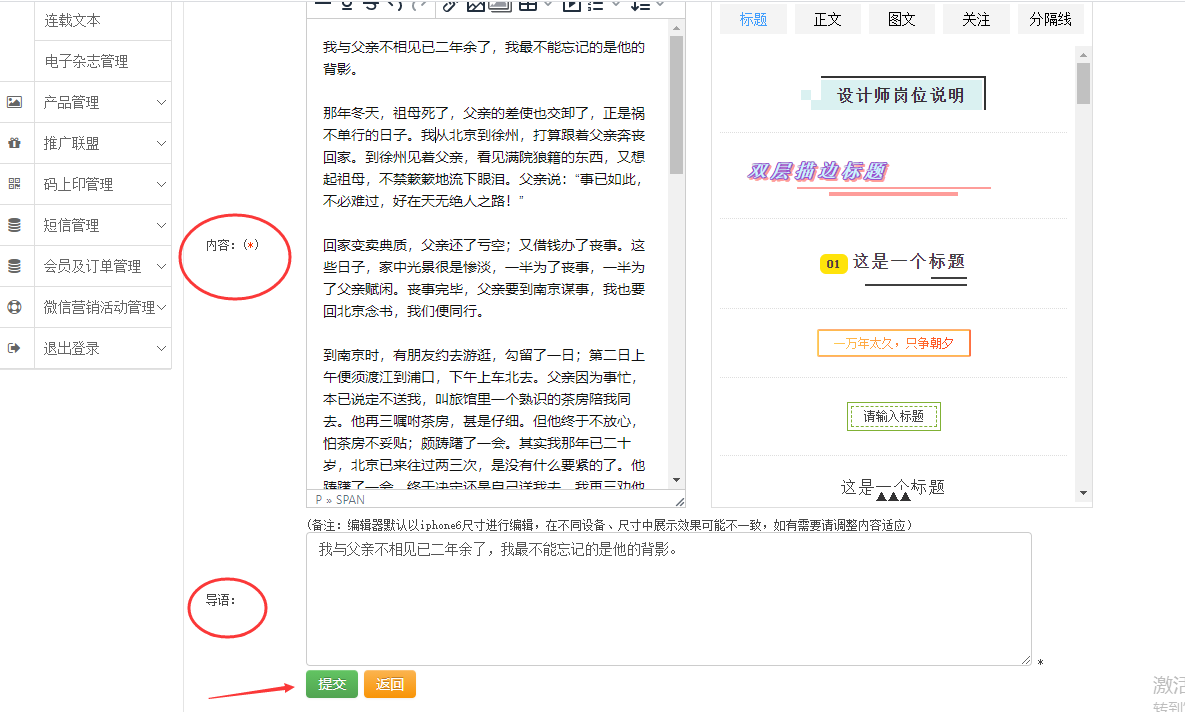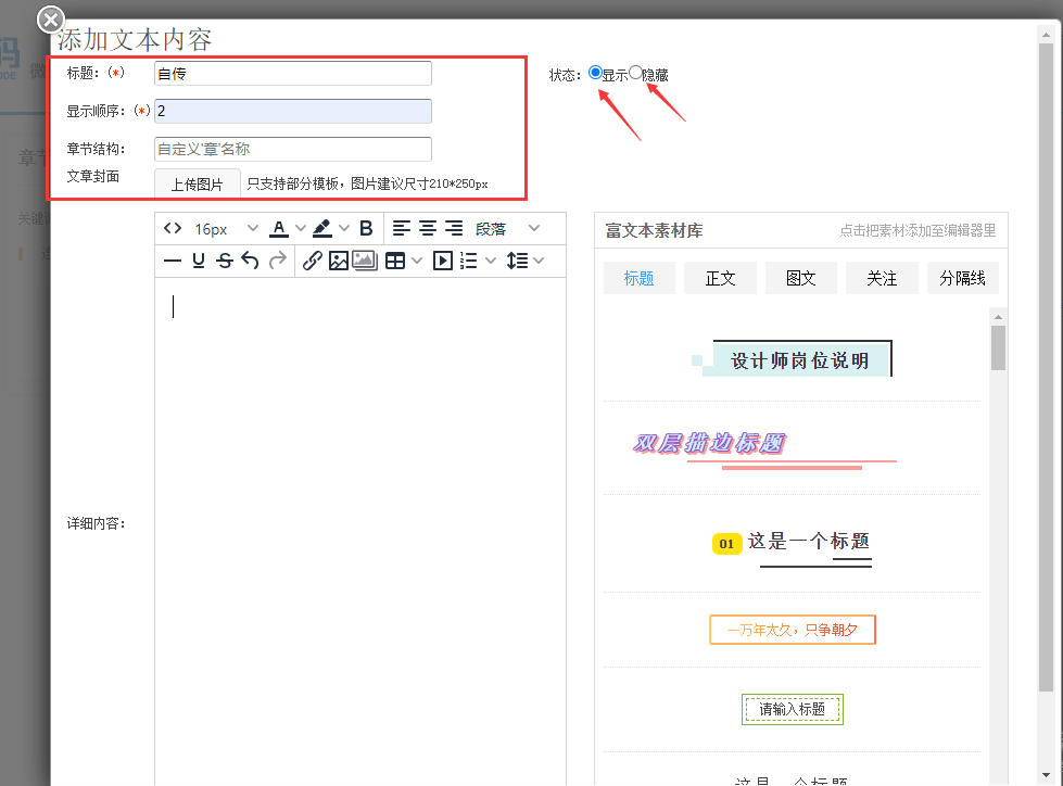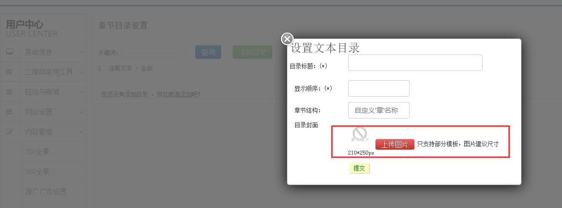 将相应的文本目录内容填写提交好之后可以点击添加内容,文章封面图片格式为JPG/PNG,推荐尺寸为210*250px如下图所示: