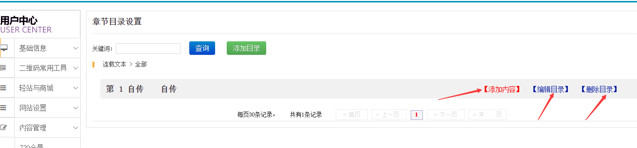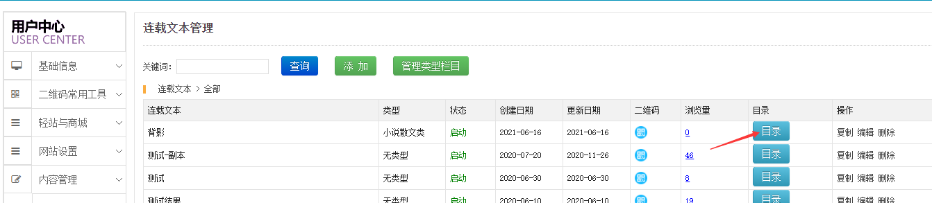 2.1返回连载文本管理栏目,添加目录进行添加,如下图所示