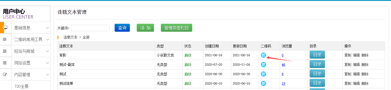 如果还需多添加几篇文章,直接点击添加目录即可。内容上传完毕后,返回连载文本列表界面,点击二维码,可扫码体验,或获取二维码印在相应的印刷品上。
